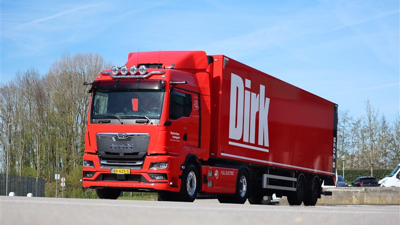 In de stralende zon komt de nieuwe MAN eTGS van Bentvelzen Transport extra tot zijn recht. De vrachtwagen staat in de kleuren van supermarktketen DIRK. Eerder werd al een eTGS