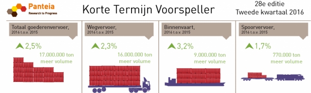 Voor 2016 wordt voor het wegvervoer een groei verwacht van 2,3 procent in vervoerd volume. Het groeicijfer is daarmee lager dan dat van de binnenvaart (dat 3,2 procent groeit), maar in absoluut volume groeit wegvervoer harder in 2016 en 2017. Voor geheel 2016 wordt vooral een groei verwacht bij de productgroepen Chemie en Energie. Van alle modaliteiten wordt in het wegvervoer in 2017 de grootste groei verwacht, zowel in groeipercentage als in de groei van volume.