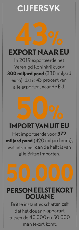 Britse instanties schatten zelf dat het douane-apparaat tussen de 40.000 en 50.000 man tekort komt. Dat verklaart de klachten die enkele bekende Engelandvaarders uit het wegvervoer onze redactie toevertrouwden. Een effect van de hele gang van zaken is dat het wegvervoer tussen het Verenigd Koninkrijk en Europa flink duurder wordt (zie kader). Volgens Transport & Logistiek Nederland genereert de goederenstroom een optocht van 160.000 voertuigen op jaarbasis die tussen het Verenigd Koninkrijk en Nederland heen en weer gevaren en gereden worden. Daarvan schat men dat 90 procent geen trekkend voertuig heeft.