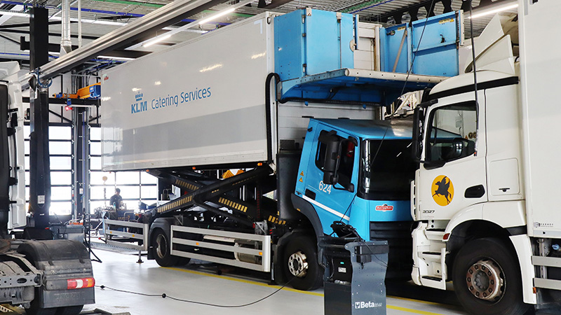 Dit betekent dat er aan de vrachtwagenzijde alleen vrachtwagens te vinden zijn. “Er zijn vijf werkstraten”, legt Wechgelaar uit. “Eigenlijk vijf en een half, want we gebruiken de plek achter de afleverruimte voor elektrische voertuigen. Daar kan de omgeving makkelijk veilig worden afgezet.” Op elke werkstraat passen drie vrachtwagens. Dat levert soms wat gepuzzel op, geeft Wechgelaar toe. De vrachtwagen met de grootste reparatie moet altijd in het midden.