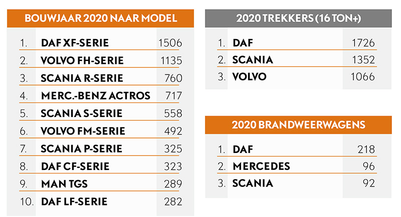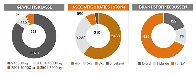 Dat de trekkers met 5118 stuks de boventoon voeren in het segment boven de 16 ton mag geen verbazing wekken. De overige opbouwvarianten zijn ieder doorgaans goed voor ergens tussen de 350 en 600 stuks, het vijftal dat overblijft komt daar alleen samen bij in de buurt met 318 stuks in totaal
