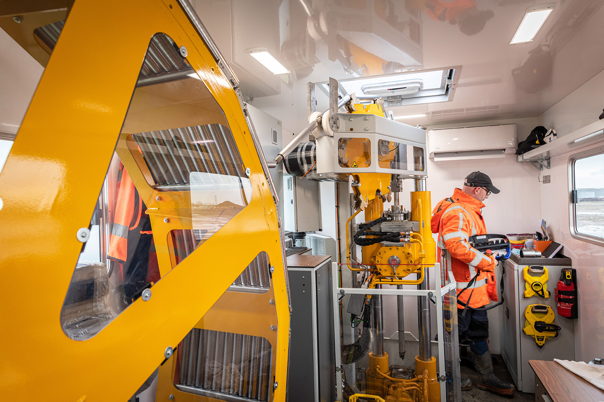 Voor die metingen heeft Van der Straaten Geotechniek een nieuwe Volvo FMX 4×4 in gebruik genomen. “Het belangrijkste bij een sondeervoertuig is de opbouw. In zijn soort is dit de tweede in Nederland. Daar waar normaal sondeerbuizen een lengte hebben van 1 meter en ze handmatig in elkaar gezet worden, heeft deze opbouw een carrousel met units van 35 centimeter die automatisch de sondeerstreng in elkaar schuift. Het proces is daarmee verder geautomatiseerd. Bijzonder is ook dat dit type voertuig (Track-Truck) voorzien is van een neerklapbaar rupsonderstel, waardoor de truck op iedere ondergrond uit de voeten kan. Dat dit grote gevolgen heeft voor het chassis spreekt voor zich. De keuze voor de Volvo FMX is onder meer ingegeven door het feit dat Volvo af fabriek een 10 tons vooras levert. Daarnaast is het gebruiksgemak voor de chauffeur van doorslaggevend belang geweest.”