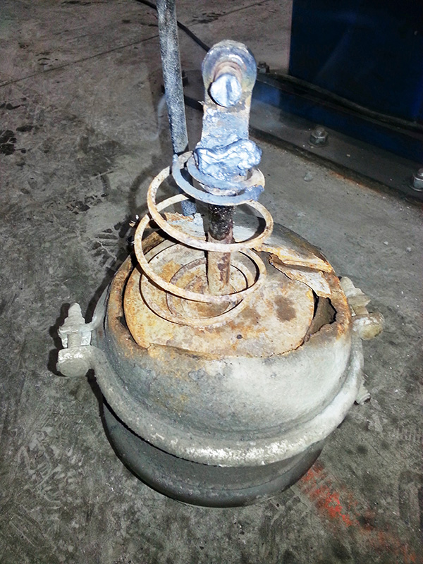 De hoofdveer heeft een drukkracht van bijna een ton. Dat is meer dan twee handen kunnen vasthouden als hij uit een volledig gecorrodeerde behuizing breekt of, erger nog, als iemand probeert de behuizing te openen. “Let er bij het demonteren altijd op dat er geen ledematen, het hoofd, het lichaam of andere collega’s in de baan van deze ‘raket’ staan.” Dit brengt ons bij het eerste punt van de visuele inspectie. Als de behuizing sterk verroest is, moet de remcilinder worden vervangen. “Roest is de grootste vijand van de remcilinder. Daarom vervaardigen we de behuizingen volledig uit staal en gebruiken we geen gegoten aluminium als tweede component. Dat is kostbaar, maar verlengt de levensduur aanzienlijk”, aldus Storm.