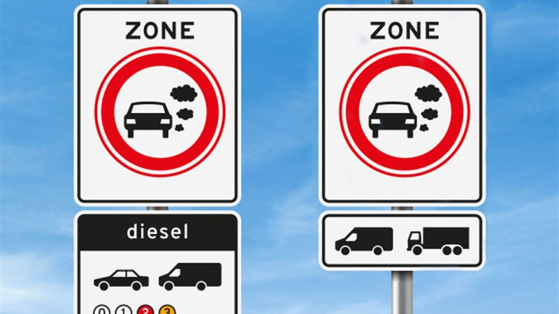 Vanaf 1 januari 2026 verschijnen nieuwe borden bij de ingang van een zero-emissiezone en milieuzone. Hoewel deze twee zones niet hetzelfde zijn, krijgen ze hetzelfde bovenbord. Aan de onderborden is te zien wat voor zone het is.